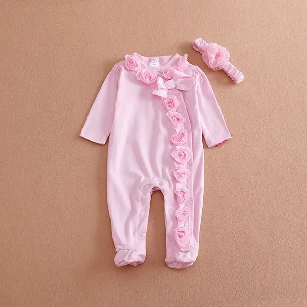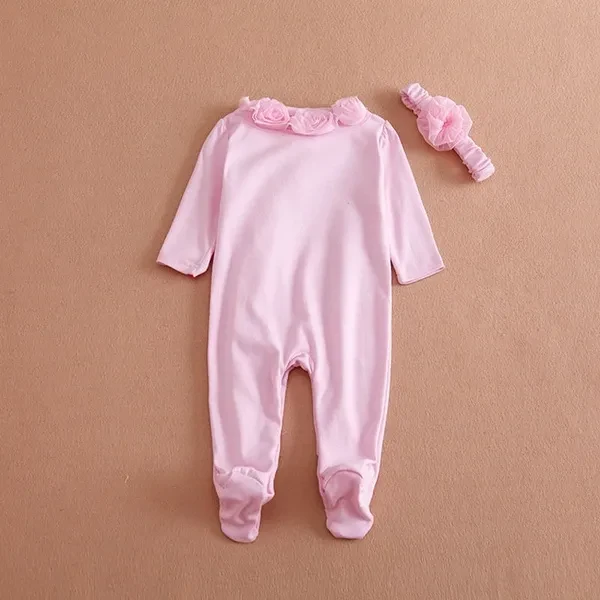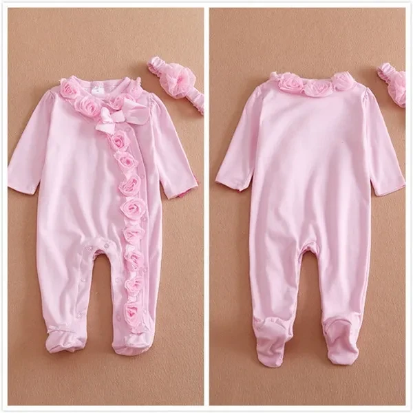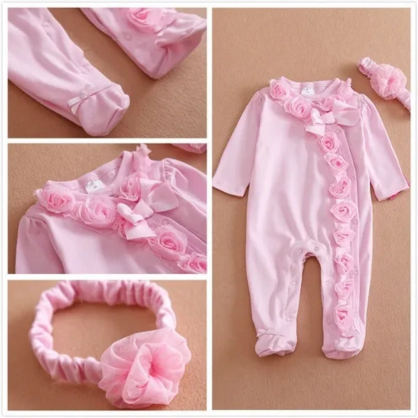 0~7M 2pc Newborn Baby Girls Long Sleeve Romper Flower Headband Clothes Outfits Set Pink