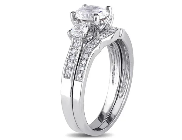 This stylish engagement ring features three brilliant round-cut created white-sapphires and white diamond side stones. This elegant set is complemented by a stunning diamond-studded wedding band. Both rings are crafted of lustrous 10-karat white gold and are enhanced with a high polish finish. This engagement ring and matching wedding band is the perfect gift that she will love.