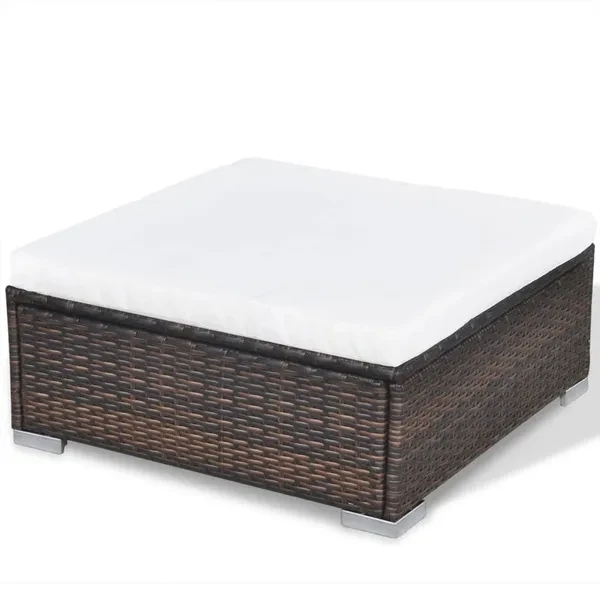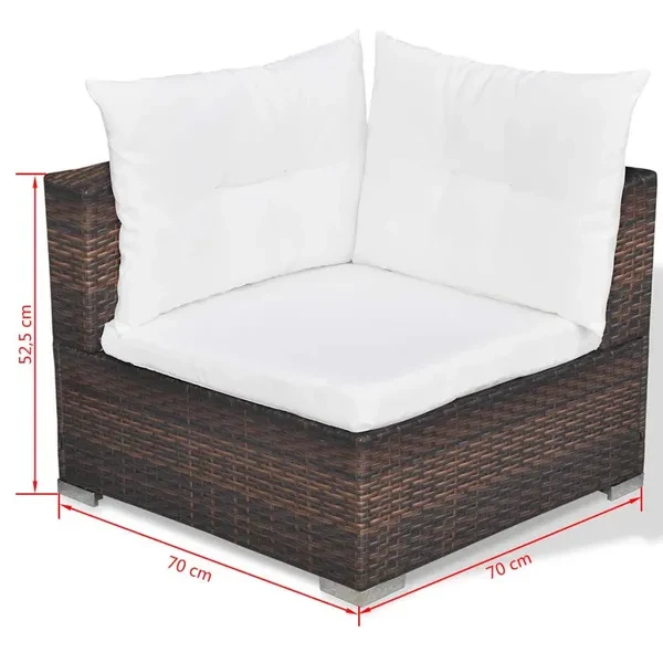 This rattan garden sofa set combines style and functionality and will be an eye-catcher in your garden or on the terrace. The entire furniture set is intended for year-round outdoor use. Thanks to the weather-resistant and waterproof PE rattan, the lounge set is easy to clean, hard-wearing and ideal for everyday use. The garden sofa set has a stable, powder-coated steel frame that is extremely durable. The lightweight and modular design makes it possible for you to rebuild or rearrange the seating area again and again to suit the space available on site. The thickly padded, removable cushions ensure high seating comfort. The scope of delivery includes 5 sofa corners, 3 sofa center pieces, 1 stool, 1 coffee table, 9 seat cushions and 13 back cushions. Rattan color: brown Pad color: cream white Material: PE rattan + powder-coated steel frame Padding material: 100% polyester Sofa corner dimensions: 70 x 70 x 52.5 cm (L x W x H) Sofa middle section dimensions: 70 x 70 x 52.5 cm (L x W x H) Ottoman dimensions: 70 x 70 x 26 cm (L x W x H) Dimensions of the coffee table: 74 x 74 x 26 cm (L x W x H) Delivery includes: 5 x corner sofa elements 3 x sofa middle section 1 x stool 1 x side table 9 x seat pads 13 x back cushions