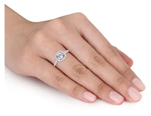 1.00 Carat (ctw) Lab Created White Sapphire Halo Engagement Ring in 10K White Gold with Diamonds This stunning halo ring is crafted in lustrous 10-karat white gold and features a stunning 1.00 carat lab created white sapphire at the centre and dazzling diamonds in a halo and halfway along the band. Enhanced with a striking finish this ring will make her gleam with happiness. Pair this ring with any ensemble for a polished look. Beautifully crafted in 10k white gold with a Polished Finish Stone Type: Sapphire; Color: White; 1.01 CTW; Quantity: 1; Brilliant Cut; Round Shape; Lab Created; Pave Setting Stone Type: Diamond; Color: H-I; Clarity: I2-I3; 0.016 CTW; Quantity: 2; Single Cut; Round Shape; Natural Sapphire Gemstone is the Birthstone for the Month of September This Diamond Engagement Ring is the perfect gift for any bridal engagement, birthday, anniversary, holidays, thank you, thinking of you, or for any reason at all SKU: 08DLG1003998CWSAW-P