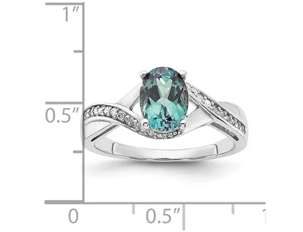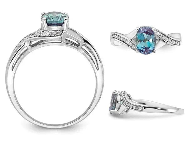 A beautiful blue-purple green multi-colored lab created alexandrite is set in sleek polished sterling silver and matched with 1/8 carat (ctw) sparkling diamonds to create a beautiful ring.