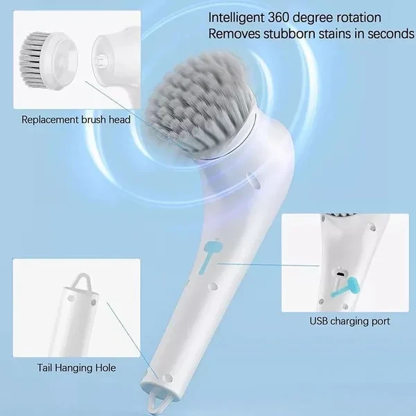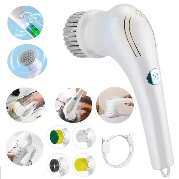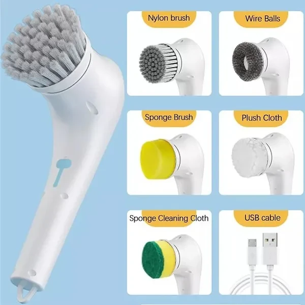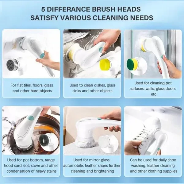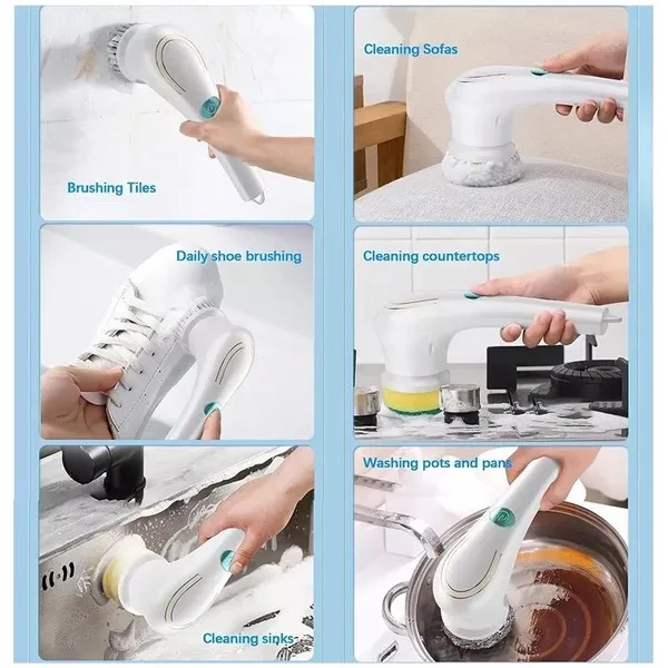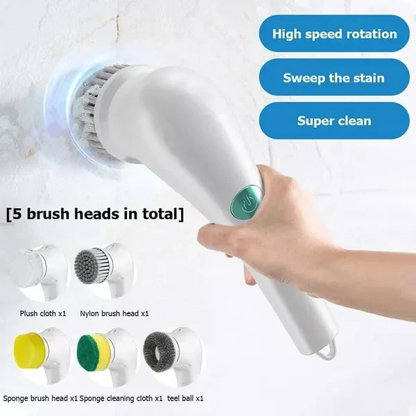 Features: Breeds a lot of bacteria, including mites, varroa, E. coli, etc,bring health hazards to you and your family. Powerful motor and 360° high speed rotation design help to easily remove stubborn stains. One-key-start operation, easy to operate with just one hand. Comes with 5 brush heads to meet you a variety of daily cleaning needs. Large capacity lithium battery, providing 90mins of working after 1 hour of charging. IPX7 Full Body Waterproof, safe to use and easy to clean( but do not soak in water for long time).  Application: Nylon brush head: Cleans flat tiles, floors, glass and other hard objects, effective in removing stubborn stains Scouring pad head: For cleaning pots and pans, walls, glass doors, etc. Sponge head: For cleaning dishes, glass sinks, etc. Steel wool head: For heavy stains on pots, pans, stoves, etc. Plush head: For further polishing and brightening of mirrored glass, cars, leather shoes, etc.  Spcification: Name: Electric cleaning brush with 5 brush head Material: ABS Color: White Waterproof grade: IP7 Charging method: USB Power supply method:Lithium battery Product List: 1 x Main body 1 x Plush fabric head 1 x Nylon brush head 1 x Sponge brush head 1 x Scouring pad head 1 x Steel wool head 1 x Charging cable Notice: 1. The actual color of the project may be slightly different from the picture displayed on the website due to many factors such as the brightness of the display and the brightness of the light. I sincerely hope you can understand. 2. The size is manually measured, and there may be an error of 0.2-0.5cm, which is a normal phenomenon.