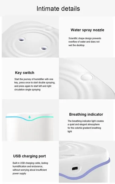 Name: Humidifier Weight: 380g Product capacity: 2000ML Use time: 12-20H Spray volume: 80ML/H Spray method: intermittent Applicable water quality: mineral water/tap water Style/color: white, green Use occasions: bedroom, home use, office, travel, Hotel, etc. Instructions for use: Press the double spray once to turn on the lights at the same time; press the second continuous spray, that is, spray to the left for two seconds, stop for 0.3 seconds, and spray to the right for 3 seconds, repeat the same; press the third time to turn off all. Long press the control switch light. When the power cord is plugged in for the first time, the indicator light will flash twice. notes: After receiving the product, please use it according to the instructions. When using it for the first time, the cotton swab needs to be soaked and moistened. Then fill the humidifier with water, install the cotton swab, and turn on the power to start working. Package list: 1x humidifier 1x USB data cable