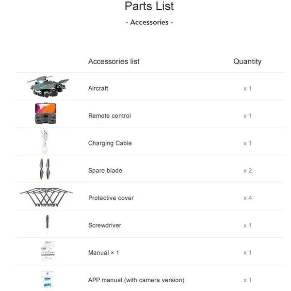Function: ascending, descending, left turn, right turn function; forward, backward, left, right. Fling, stunt roll, headless mode, high hover, WiFi real time video camera, gorgeous air light, APP remote control, gravity induction, three speed control.