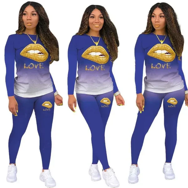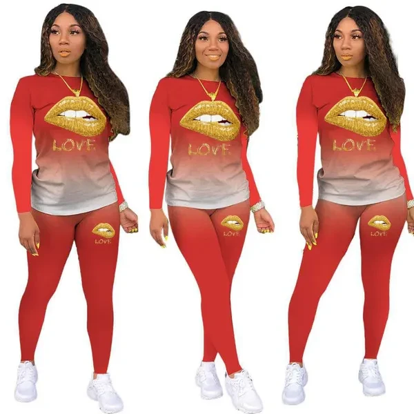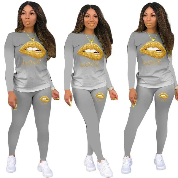 2022 New Trendy Two-Piece Set Fashion Women Sweatshirts Set Gold Love Lip Printed Sports Suit for Women's Clothing Plus Size