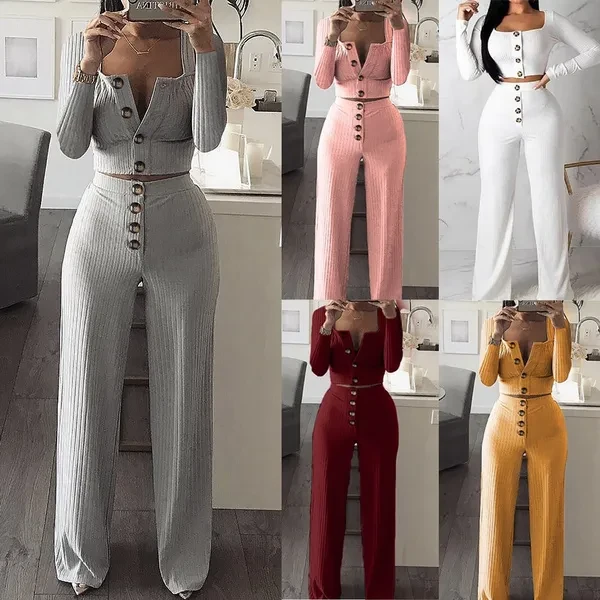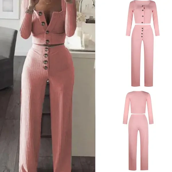 2pcs Women Fashion Long Sleeve Slim Knitting Tops + Straight Pants Women Clothing Set