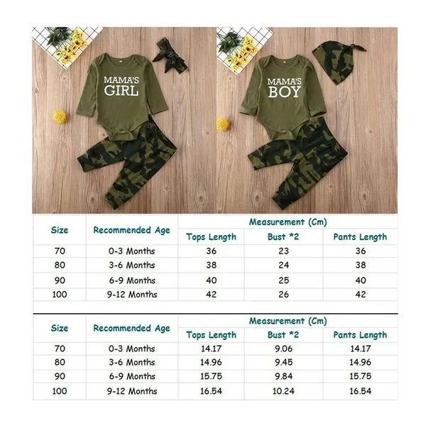WELCOME - Quality is the first with best service. customers all are our friends. - Fashion design,100% Brand New,high quality! ❤ What You Got: (You will have two options) ※ For Boy: 1 x Romper Tops & 1 x Pants & 1 x Hat ※ For Girl: 1 x Romper Tops & 1 x Pants &1 x Headband - Material: Cotton Blend - Color: As shown in the pictures - Listing Includes: Three-Pieces Outfits - Sizes: 70/80/90/100 Cm Size Chart: Size Age Measurement (Cm) Tops Bust *2 Pants Length 70 0-3 M 36 23 36 80 3-6 M 38 24 38 90 6-9 M 40 25 40 100 9-12 M 42 26 42 Size Age Measurement (Cm) Tops Bust *2 Pants Length 70 0-3 M 14.17 9.06 14.17 80 3-6 M 14.96 9.45 14.96 90 6-9 M 15.75 9.84 15.75 100 9-12 M 16.54 10.24 16.54 There is 2-3% difference according to manual measurement. please check the measurement chart carefully before you buy the item. 1 inch = 2.54 cm Please note that slight color difference should be acceptable due to the light and screen.