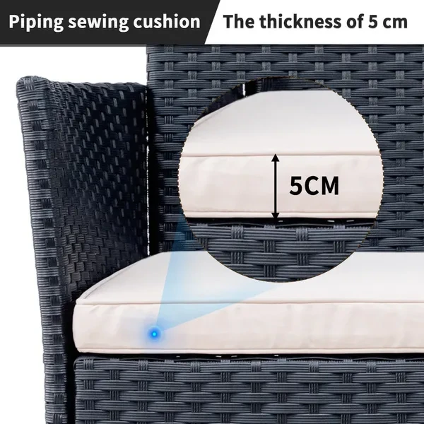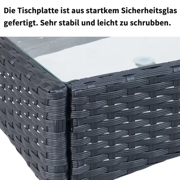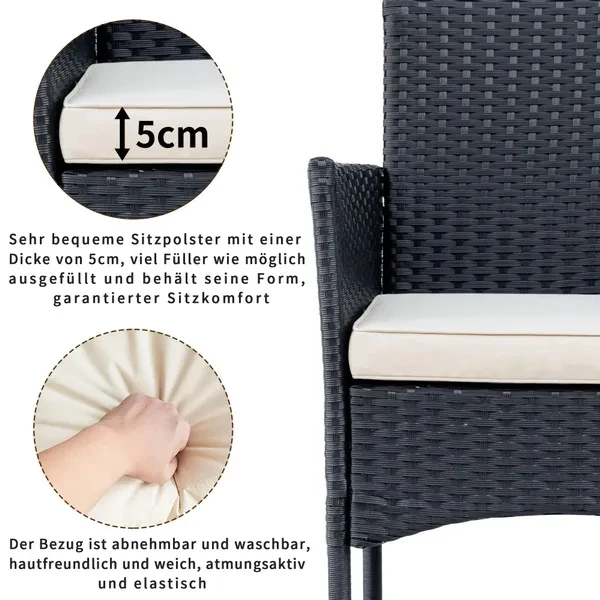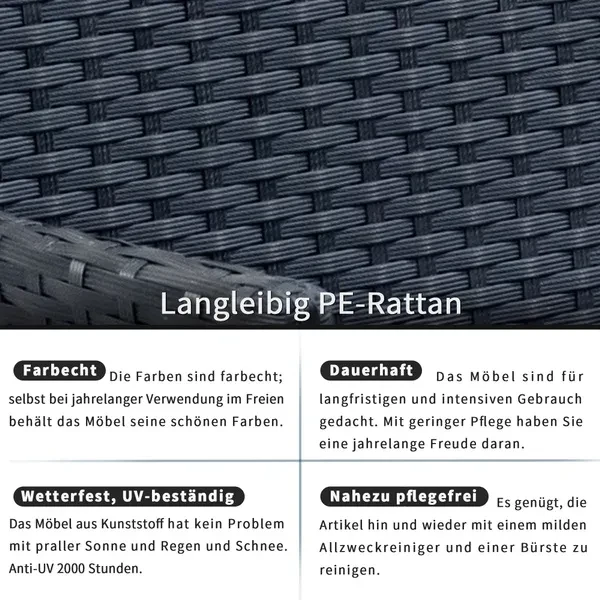 description POLYRATTAN-ROBUST, WEATHER-RESISTANT, HIGH UV-RESISTANT AND EASY-CARE. Polyrattan is weatherproof and withstands central European weather conditions. The tear- and tensile-resistant material easily withstands rain, high temperatures and intense sunlight. This means that poly rattan keeps its beautiful color for years. In addition, dirt cannot penetrate the fibers and therefore only sits superficially. Thus it is very easy to care for. The braid can be easily kept clean with a damp cloth and mild detergent. COMFORTABLE SEAT CUSHION - The 5 cm thick seat cushions allow you to sit softly for hours. The pillow is removable and the pillowcase is washable. Elegant side bands ensure that the pillow keeps its shape. The soft surface cloth offers a smooth finish and great feel. The simple pillowcases can be easily removed thanks to the concealed zippers and cleaned at 30 degrees.