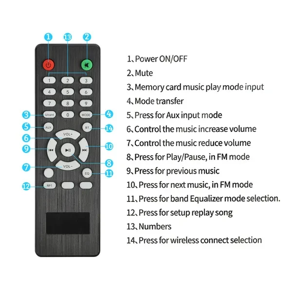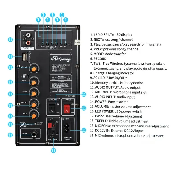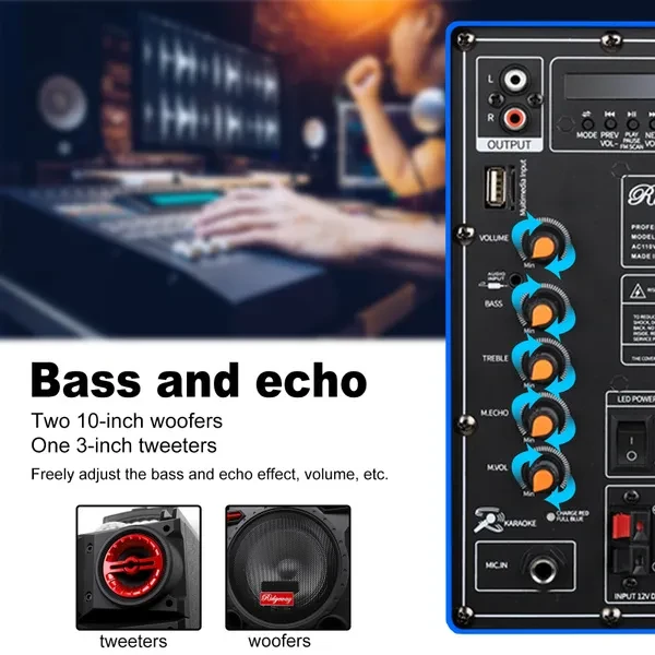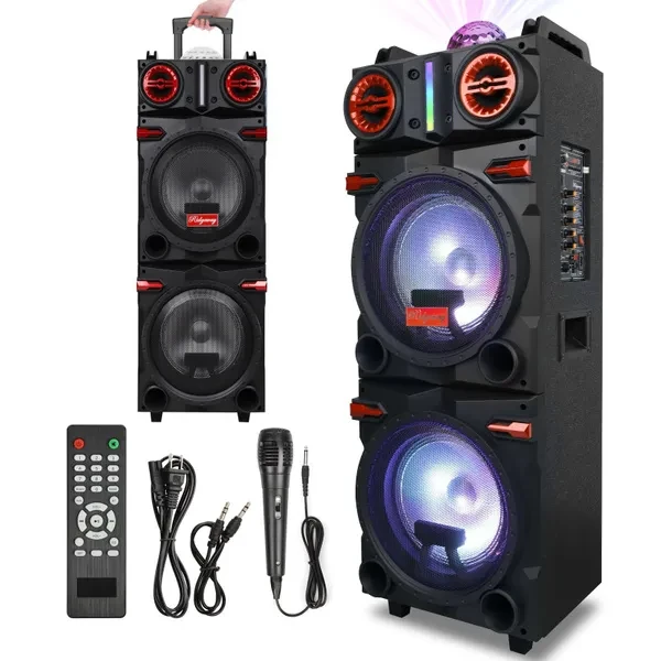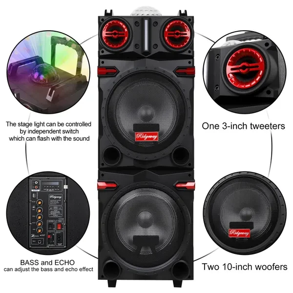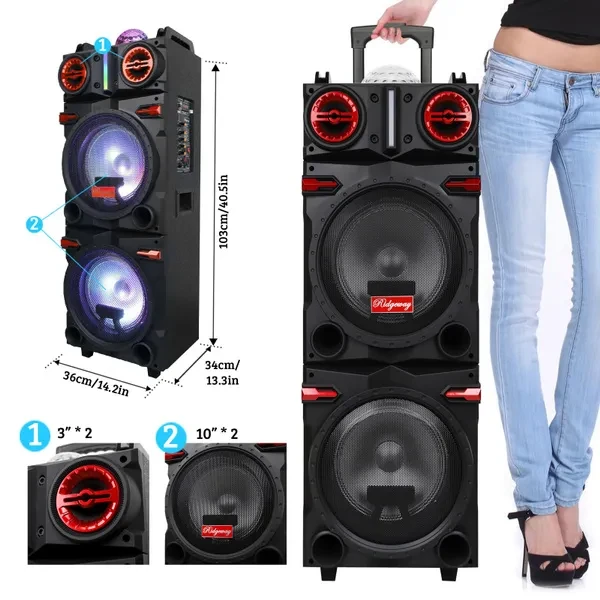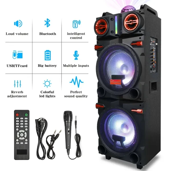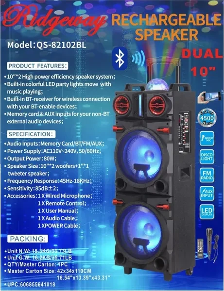 Feature: 2 X 10 Inch high power efficiency speaker system; Built-in colorful LED party lights move with music playing; With Bluetooth receiver for wireless connection with your BT-enable devices; Memory card and AUX input for your non-BT external audio devices; With a wired Microphone and remote control. Specification: Audio input: Memory card, BT, FM, AUX; Power supply: AC110V-240V, 50 / 60 Hz Output Power: 80W Speaker Size: 2 X 10” Woofers + 1 X 1” Tweeter speaker Frequency Response: 45Hz - 18KHz Sensitivity: 85dB Unit N,W: 33.73 lbs Unit G.W: 35.71 lbs Package Size: 16.54” X 13.39” X 43.31” You will get: 1 X Bluetooth Speaker 1 X Wired Microphone 1 x User Manual 1 x Remote Control 1 X Audio Cable 1 x Power Cable