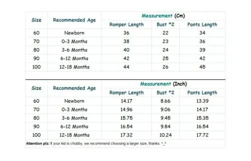 - Quality is the first with best service. customers all are our friends. - Fashion design,100% Brand New,high quality!- Material: 100% Cotton - Color: As shown in the pictures- Listing Includes: Four-Pieces Outfits - Sizes: 60/70/80/90/100CmSize Chart: Attention plz: If your kid is chubby, we recommend choosing a larger size, thanks. Size Recommended Age Measurement (Cm)Romper Length Bust *2 Pants Length60 Newborn 36 22 3470 0-3 Months 38 23 3680 3-6 Months 40 24 3990 6-12 Months 42 25 42100 12-18 Months 44 26 45 Size Recommended Age Measurement (Inch)Romper Length Bust *2 Pants Length60 Newborn 14.17 8.66 13.3970 0-3 Months 14.96 9.06 14.1780 3-6 Months 15.75 9.45 15.3590 6-12 Months 16.54 9.84 16.54100 12-18 Months 17.32 10.24 17.72 There is 2-3% difference according to manual measurement. please check the measurement chart carefully before you buy the item. 1 inch = 2.54 cm Please note that slight color difference should be acceptable due to the light and screen.What You Got: 1 x Romper , 1 x Pants, 1 x Hat, 1 x HeadbandPreview: Payment and Shipping International Buyers Please Note: Import duties, taxes and charges are not included in the item price or shipping charges. These charges are the buyer's responsibility. Please check with your country's customs office to determine what these additional costs will be prior to bidding/buying. Item will be sent to buyer's Ebay shipping address ONLY, so please CONFIRM your available address on Ebay before pay through paypal. But sometimes international delivery is highly depended on the Courier Company and local customs/duties. If you do not receive your item on time, please contact us immediately for further assistance. Thank you for your understanding. Shipping Method: The items will be shipped by China Post , It will take 15-25 working days from shipment date. The items will be shipped by USPS to USA, Absolutely Safe! EVERY PACKAGE HAVE TRACKING NUMBER. It will take 7-12 working days from shipment date. We also supply with DHL, UPS, EMS express shipping, but you need pay more money for express shipping. If you need express shipping service, please contact us before order(Telephone are must for international express shipping, If you need express shipping service, Please note your Telephone when your payment.) Shiping Time: All items will be posted to you within 3 working day (on the weekdays - Monday to Friday) the payment is cleared on seller's side Estimated delivery time International package takes about 15-20 days to ship to destination; By post office past shipping statistic report, here below is the arrival lead time performance table for some countries, which is for buyer reference only. We accept only PayPal payment. Please make sure you have a valid/confirmed PayPal account before bidding All PayPal Payments must be Confirmed (Shipping and billing addresses must match)Payment is required within 7 days from the date of the auction ending A non-payment dispute will be automaticcally opened if full payment is not received after 14 days of auction. Return is accepted within 14 days after the buyer's receiving the item. (Excluding contrived damagement or misusage).100% money-back Guaranteed! All product will be tested in 100% before delivery.If the item is defected by the processing of postage,Buyer has up to 14 days from date of receipt for exchange of a new one.All shipping charges for returned products are to be paid by the buyer,Please contact us for the return address. We left positive feedback for you after receiving payment. Your feedback is very important for us, positive feedback and 5 Score DSR is highly appreciated. Please let us know before leaving any negative feedback or 1 point, 2 point low DSR or open any disputes on Paypal and Ebay, please give us the opportunity to resolve any problems and we will try our best to satisfy your needs. If any question, please feel free to contact us via "Ask seller a question" ,We try our best to reply to your emails as soon as possible, due to high volume of daily incoming emails and time zone difference, we may not be able to reply your emails immediately.Please aaallo963-w 1-2 business days for us to response. On Feb-17-20 at 02:06:27 PST, seller added the following information: