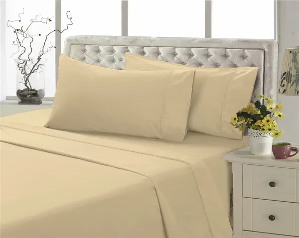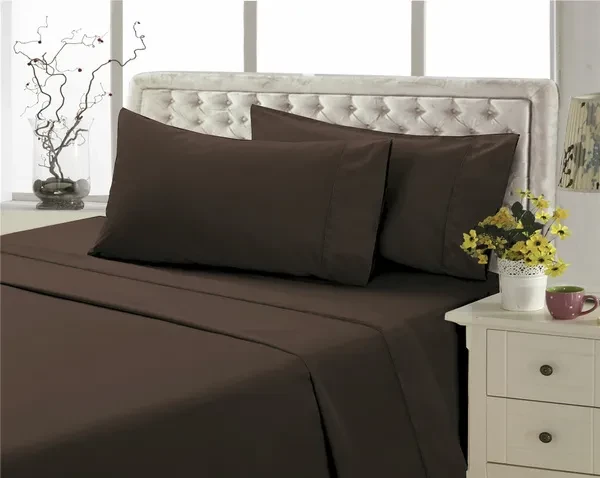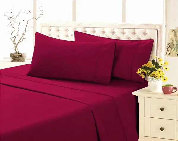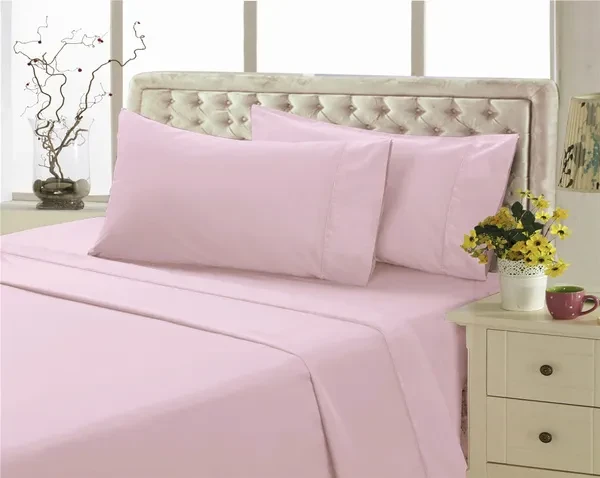 100% polyester microfiber Offers strength and exceptional softness Wrinkle resistant; solid color Fitted sheet has elastic to stretch and fit snugly over mattresses up to 15-inches deep Easy to care for: machine wash warm, no bleach, tumble dry low SIZE INFORMATION: Twin set: 1 Flat sheet 66"*96",1 Fitted sheet 39"*75"+12" Deep pocket,1 Pillowcase 20"*26"+4" Hem Full set:1 Flat sheet 81"*96", 1 Fitted sheet 54"*75"+15" Deep pocket, 2 Pillowcases:20"*30"+4"Hem Queen set:1 Flat sheet 92*102",1 Fitted sheet 60"*80"+15"Deep pocket,2 Pillowcases:20"*30"+4"Hem King set:1 Flat sheet 102"*106",1 Fitted sheet 54"*75"+15"Deep pocket,2 Pillowcases:20"*30"+4"Hem