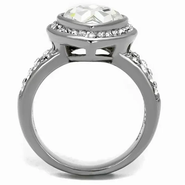 This beautiful high polished AAA grade pear cut crystal halo engagement ring is Amazing! Made of solid stainless steel with a high polished finish (no plating). This ring features a 5.41 carat (14mm x 10mm) pear cut solitaire stone in a bezel setting, alongside 30 (1.5mm) round cut stones in a paved setting to form a halo, and 16 (2mm) pave set stones on the band. The total carat weight is approx. 6.34 diamond equivalent. This ring has Top quality stones and displays amazing enriched clarity just like real diamonds! Stainless Steel jewelry is durable, hypo-allergenic and will not tarnish or oxidize over time.