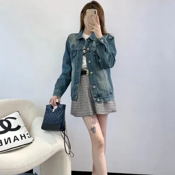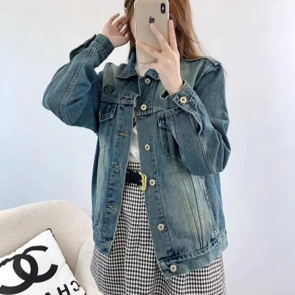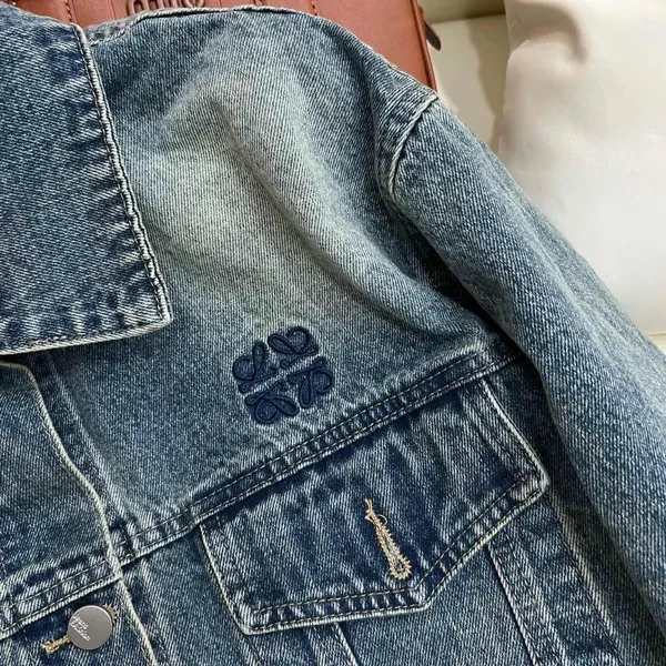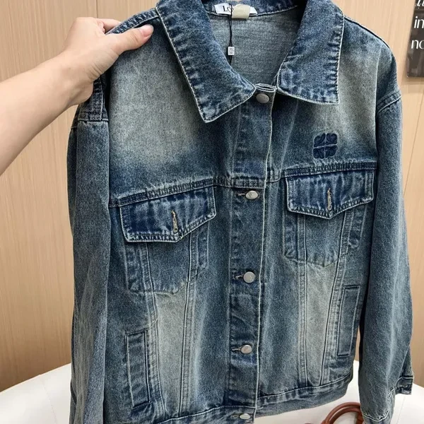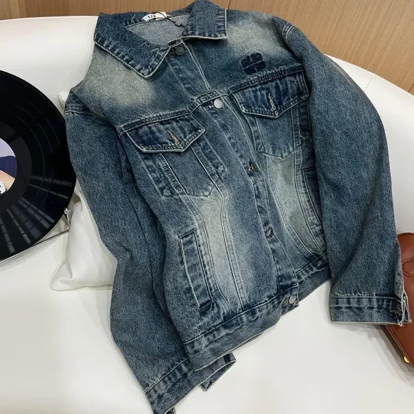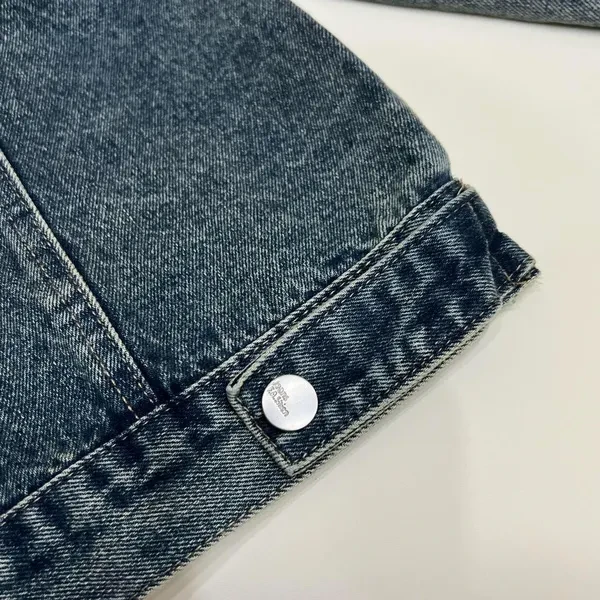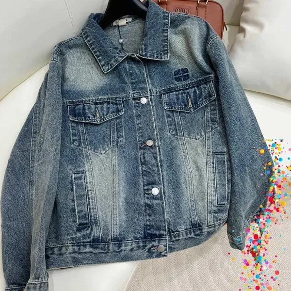 Short button-down denim jacket. It's so perfect for matching in autumn. With its classic embroidered lapels, the distressed denim blue with washed effect makes you look fair-skinned and gives it a sophisticated touch! Size reference: S Shoulder width 52 Bust 112 Sleeve length 55 Clothing length 62 M Shoulder width 53 Bust 116 Sleeve length 56 Clothing length 53