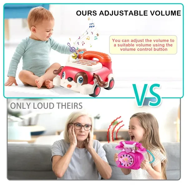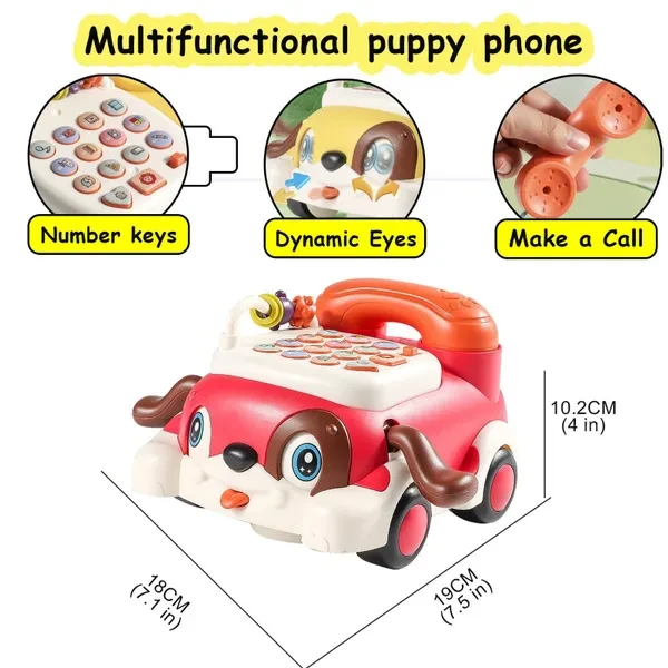 【Requires 3 AA batteries (not included)】 Here's the revised version of your five points, adhering to the guidelines provided: Multifunction Phone Toy for Kids: Our upgraded Puppy Baby Phone Toy is a versatile music toy with integrated lights and sounds. It features 14 buttons including music, lullabies, numbers, and a question-and-answer mode to enhance children's logic skills, interest in music, and hand-eye coordination. Perfect as a toddler cell phone toy Automatic Walking Telephone Toy: This telephone toy allows toddlers to pretend to call and chat, fostering communication skills from an early age. The automatic movement function with a universal wheel lets children chase the toy while crawling, making it an engaging fake phone for kids Easy to Use: With only a few buttons and two mode switches, this play telephone is simple for children to operate. Its ornamental design makes it suitable for bedside placement. Ideal for interactive role-play, it's perfect for solo or group play, satisfying kids' curiosity Safe Material & Powerful Battery Life: Crafted from smooth, burr-free plastic, this baby phone toy ensures safe play. It automatically enters sleep mode after a period of non-use to save power. secured with screws so children cannot remove them. A durable toddler play telephone Great for Kids & 30-day Customer Service: This kid phone toy is an ideal choice for birthdays, Christmas, or holidays. Excellent as a play kitchen accessory or fake telephone phone for kids