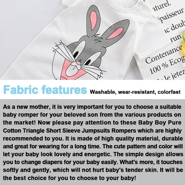 Hello, welcome to my shop! all items are ready stock! Size chart: Size / Recommended Height / Length / Bust / Shoulder Widt / Leg Circumference / Hip Circumference 0-6 months <66cm 42 50 21 24 58 6-12 months <73cm 45 52 22 24 60 12-18 months <80cm 48 54 23 26 62 18-24 months <90cm 51 56 24 28 64 Introductions: As a new mother, it is very important for you to choose a suitable baby romper for your beloved son from the various products on the market! Now please pay attention to these Baby Boy Pure Cotton Triangle Short Sleeve Jumpsuits Rompers which are highly recommended to you. It is made of high quality material, durable and great for wearing for a long time. The cute pattern and color will let your baby look lovely and energetic. The simple design allows you to change diapers for your baby easily. What's more, it touches softly and gently, which will not hurt baby's tender skin. It will be the best choice for you to choose to your baby! Features: 1. New and high quality 2. Easy for changing diapers 3. So lovely elegant dress is perfect to wear in any occasions 4. It touches very softly and gently, so that it will not hurt the tender skin of the baby, it is absolutely the best choice of caring mommy 5. This design is very lovely and matches with the lovely little baby very well Specifications: 1. Color & Pattern: 7 colors 2. Material: Cotton 3. Size: 0-24M 4. Suitable for: Baby Boy & Girl 5. Item Type: Rompers 6. Pattern Type: Cartoon 7. Closure Type: Covered Button 8. Sleeve: Short sleeve 9. Collar: O-neck 10. Pattern: Print 11. Fit: Fits true to size, take your normal size 12. Washable: Yes Package Includes: 1 x Rompers #romperbaby #jumpsuit #babyclothing #nightwear #kidsclothing #romper #readystock #rompers #baby #baju #Clothes #babygirlclothing #babyboy #kids #babyboyclothing #kidsfashion #Onepiece #borong