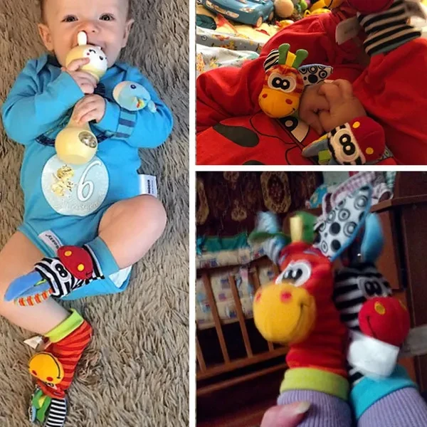 Baby Toys Wrist Strap Rattles Animal Zebra Socks Soft Infant Stroller Toys Hand Foot Developmental Baby Toys 0-12 Months Features: Interesting&attractive - attract baby attention, let the world of baby filled with sound just by gently shaking hands. Adjustable adhesive wrist band is easy for you to choose the comfortable size for your baby. Built-in rattle(ring bell) to emit soft rustle sound.(lighter sound, so it is easily for kids to looking for and find it) Baby getting like observing their fingers and sucking it since they are 3 months old. Put on this cute wrist band for baby so they can easily find their lovely hands. Cute&lovely look - beautiful and colorful. Specifications: Type: baby rattle toys Material: cloth Socks: Approx 16.5*6.5cm/6.5*2.6inch Wrist bands: Approx 16*4cm/6.3*1.6inch Weight: Approx 47g/1.7oz Size: Approx 16.5*6.5*3cm/6.5*2.6*1.2inch