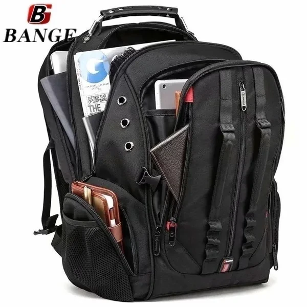 Features: Craft And Philosophy:Made of high quality Oxford, we selected dozens of materials for durability testing, design for ease of use in life, reinforcement at various stitches, handles, shoulder straps, etc. we are committed to creating high quality and practical products. Specifications And Humanize Design:This large-capacity backpack size is 20*15*10.5 inches and fit for 14,15.6 inch laptops,The entire large backpack contains multiple pockets, and we take into user's feelings, the back and shoulder straps are decompression processing, beside,it also has high quality of the best zipper, multifunctional connection of USB charging port and headphone interface, and so on. Large Capacity & Organized:Its capacity is 40L, with 3 longitudinal pockets on the front panel; an organized pocket in the middle; a large capacity in the main pocket; a laptop-specific compartment, two pockets on both sides of the bag, a pocket on the back of the backpack, and a small braided pocket with red inside each large pocket.It's convenient for personal items to place.we can hold it up to Daily Commute to and from Work(it's cool and has much useful design consideration). Multipurpose:Fast through airport security, 180-degree open notebook pocket,The big backpack is great for indoor/outdoor activities. Served as everyday/weekender backpack,large school backpack for man/ women/teen boys/girls,15.6 inch laptop backpack or spacious college backpack,you can use it at anywhere for International travel,Camping,Hiking and Overnight trip. Specifications: Brand: BANGE Material: High Quality Oxford Lining: Polyester Colors :Black Weight:1.2 kg / 2.6 lb Size: 38*26.7*51 cm / 15*10.5*20 in(Length*Width*Height) Fit For 15.6" Laptop Interior: Interior Compartment, Computer Interlayer, Inside Zipper Pocket, Inner Slot Pocket, Cell Phone Pocket Package List: 1* Large capacity backpack