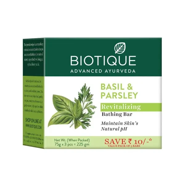 Biotique Bio Basil and Parsley Body Revitalizing Body Soap, Pack of 3, 225 g (3 x 75 g)This clear soap is a blend of pure basil, parsley, margosa, wheat germ and coconut oil, to gently wash away body impurities, without disturbing the skin’s natural ph balance.Biotique Bio Morning Nectar Flawless Cream Bathing Bar, 150gThis soap is blended with nourishing almond and coconut oils, mixed with turmeric and wild turmeric, to gently wash away body impurities, without disturbing the skin natural ph balance. Recommended for sensitive skin type.