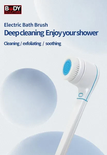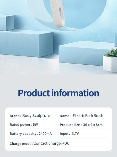 BODY SCULPTURE electric bath brush Deep Cleaning Shower Experience with Exfoliating, Soothing, and Spa-Like Comfort Brand: BODY SCULPTURE Color: White, Blue Product size: 36x9x8cm Batterycapacity: 2400mA Material: Other Rated power:5W Input: 3.7V Charge mode: Contact charger+DC Deep Cleaning Performance: The electric bath brush delivers an exceptional deep cleaning experience, ensuring your skin feels refreshed and revitalized after every shower. Perfect for those who want to take the first step in caring for their skin. Multi-Functionality: Enjoy a 3-in-1 experience with cleaning, exfoliating, and soothing capabilities. It's just like doing a spa treatment at home, providing ultimate relaxation and care. Interchangeable Brush Heads: Equipped with different brush heads to suit various skin types and preferences, allowing you to switch modes anytime for customized cleansing. Extended Handle Design: Featuring an extended handle that makes it easier to reach all areas of your body, enhancing convenience and efficiency during use. Shower-Friendly Innovation: Designed specifically for use in the shower, this electric bath brush ensures a hygienic and comfortable cleaning process every time. Easy Maintenance: Built for long-lasting performance with simple maintenance requirements, so you can focus on enjoying your spa-like shower routine.