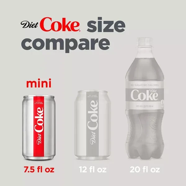 Delivery is not available to Puerto Rico, HI, AL,AE, APO/FPO or PO box addresses Highlights:- 30 pack, 7.5 fl oz mini cans of Diet Coke Crisp and refreshing soda with no sugar and no calories to refresh your day Enjoy the great taste of Diet Coke, a diet cola that has no sugar and no calories Take a Diet Coke break with this refreshing, no-calorie soft drink 28.8 mg of caffeine in each 7.5 fl oz serving About this item:- Experience Refreshment with Diet Coke:- Quench your thirst with the one and only Diet Coke. This diet soda stands out as an ideal no-sugar, no-calorie companion, ready to refresh your day. Diet Coke's unique taste comes from a blend of flavors and the effervescence of carbonation, providing a bold and satisfying experience without the calories. A Taste That Delights:- Every sip of Diet Coke delivers the same great taste that has pleased fans for years. Whether you're seeking some personal relaxation or a way to brighten your day, this everyday go-to is the perfect partner. The distinctive taste of Diet Coke offers a unique "ahh" moment with each sip, making it a trusted soft drink choice for over four decades. Open Happiness with Diet Coke:- When you desire a sugar-free soda that doesn't compromise on taste, reach for a Diet Coke. This diet soft drink helps you make the most of any occasion, offering a balance of bold flavor and refreshing fizz. So, open happiness and experience the timeless delight of Diet Coke.