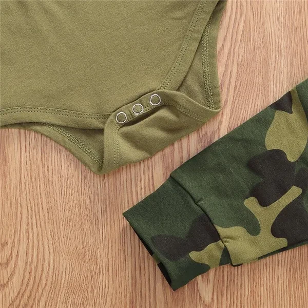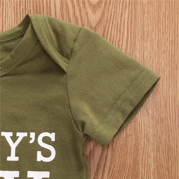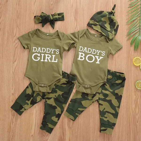Fashion Daddy's Boy Girl Newborn Toddler Baby Clothes Letter Print Romper Tops + Camo Pants + Hat Outfit Set Romper Tops + Camouflage Pants + Hat/Headband --- Soft and breathable, lightweight to wear. Comfy for baby's tender skin Size chart:(cm/inch) Size(cm): 70 Top Length:36 Bust:44 Pant Length:36 Age:0-3 Months 80 Top Length:37 Bust:46 Pant Length:37 Age:3-6 Months 90 Top Length:38 Bust:48 Pant Length:38 Age:6-9 Months 100 Top Length:40 Bust:50 Pant Length:40 Age:9-12 Months Size(inch) 70 Top Length:14.17 Bust:17.32 Pant Length:14.17 Age:0-3 Months 80 Top Length:14.57 Bust:18.11 Pant Length:14.57 Age:3-6 Months 90 Top Length:14.96 Bust:18.90 Pant Length:14.96 Age:6-9 Months 100 Top Length:15.75 Bust:19.69 Pant Length:15.75 Age:9-12 Months Friendly Tips: 1. Please kindly allow a 2-3% difference according to manual measurement. 2. Please check the measurement chart carefully before you buy the item. (1 inch = 2.54 cm) 3. Please note that a slight color difference should be acceptable due to the light and screen. Thanks. Specification: Gender: Unisex Material: Cotton Sleeve length: Short sleeve Pattern: Letter, print, camouflage Size: 0-3M/3-6M/6-9M/9-12M Package Contents: 1x Romper + 1x Pants + 1x Headband or 1x Hat Promise If the product has any quality problems, please feel free to contact us, we will help you solve the problem as quickly as possible. thanks!