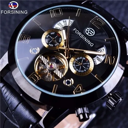 Description: -Genuine Leatherleather band gives you a new classic definition. - Tourbillon dial design reveals your fashionable point of view. - Stainless steel watch case makes the watch more durable. - Daily water resistance (not for showering and swimming). - Color may not appear as exactly as in real life due to variations between the computer monitors and nacked eye color difference. Specification (approx): - Diameter: 46mm - Thickness: 15mm - Length of watch band: 24.5cm - Band width: 24mm - Movement: Mechanical watches - Watch band: Genuine Leather - Watch case: Stainless steel Package includes: - 1 x Mechanical watch - 1* Forsining Cardboard Gift Box Reminder: 1. Please peel all films off before wearing. 2. Please keep the watch away from magnet to avoid making the watch stop working. 3. Please wind up the watch before every usage.