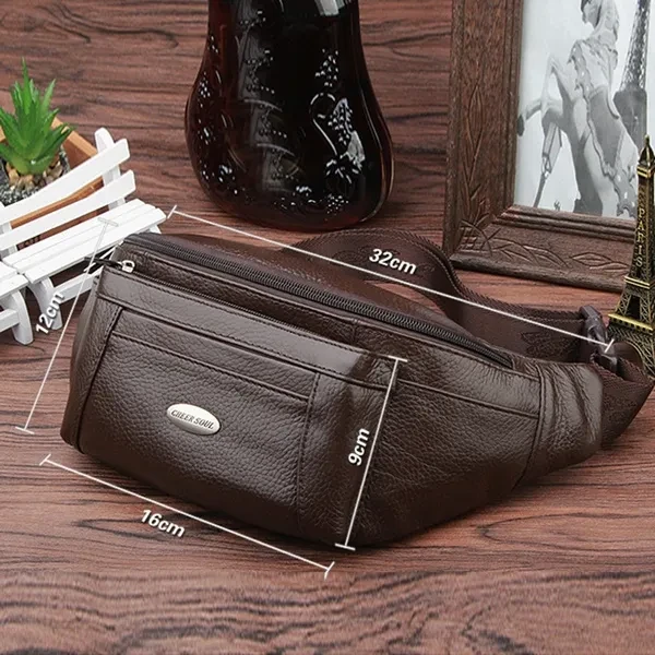 •Style :Fanny/Waist/Messenger/Chest /Belt Bag; Color : Black,Coffee; Materials:Real Leather(high-quality); Total size: (W x D x H): 32 cm x 8 cm x 12 cm(12.60 x 3.15 x 4.72 in); Shoulder Strap(Adjustable): 85 cm(33.5 in); Waist Circumference:115 cm(45.28 in); •Please Note: Due to manual measurement, there maybe 2-3 cm difference; •Please Note: The lighting and displays can cause color difference, We appreciate your understand!