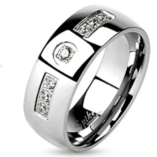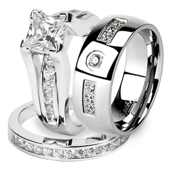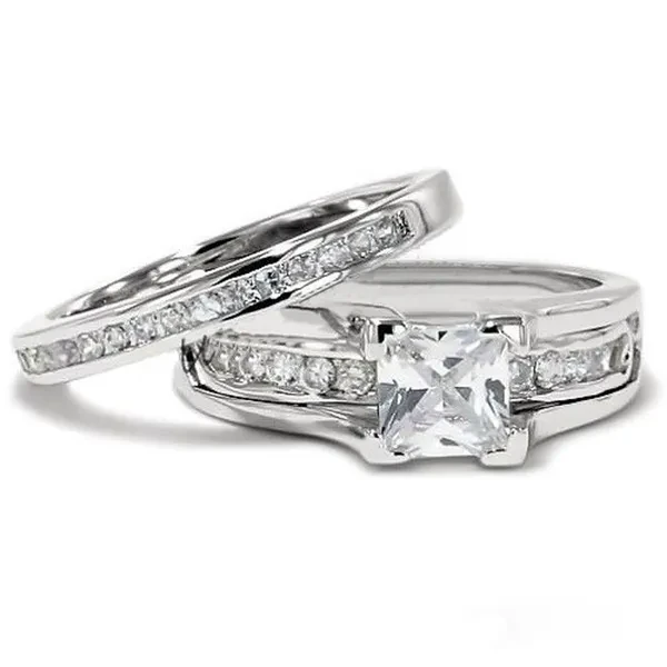 Women's ring This women's beautiful 2 piece AAA grade cubic zirconia wedding set is amazing. Engagement ring features a 1.25 ct (6mm) princess cut center stone alongside 21 round side stones. Matching wedding band has 15 round cut stones in a channel setting. Total carat weight is approx 2.10 diamond equivalent. Top quality stones display amazing enriched clarity just like real diamond! Made from solid sterling silver (stamped .925) with high quality rhodium plating for years of carefree wear and shine (platinum look). Men's Ring 6mm or 8mm 316L Stainless Steel Cubic Zirconia Inlay with Center Stone Classic Wedding Band Ring. Features a clear .06 ct (2.5mm) round cut center stone accented by six (2mm) round cut stones. Total carat weight is .24 diamond equivalent. Top quality stone looks just like real diamond! Interior of band is slightly rounded to provide a comfortable fit for daily wear. Made of solid stainless steel with mirror polished finish. High quality stainless steel provides years of carefree wear and will not tarnish or discolor. Men's and Women's sizes available. All rings are U.S.A size rings. Please look at photo of chart for the equivalent international sizes. IF YOU ARE NOT SURE OF YOUR SIZE. YOU CAN MEASURE YOUR RING SIZE AT WWW.FINDMYRINGSIZE.COM Ring Sizes USA Size 5 = about 16mm diameter USA Size 6 = about 16.5mm diameter USA Size 7 = about 17.5mm diameter USA Size 8 = about 18mm diameter USA Size 9 = about 19mm diameter USA Size 10 = about 20mm diameter USA Size 11 = about 20.5mm diameter USA Size 12 = about 21.5mm diameter USA size 13 = about 22.5mm diameter