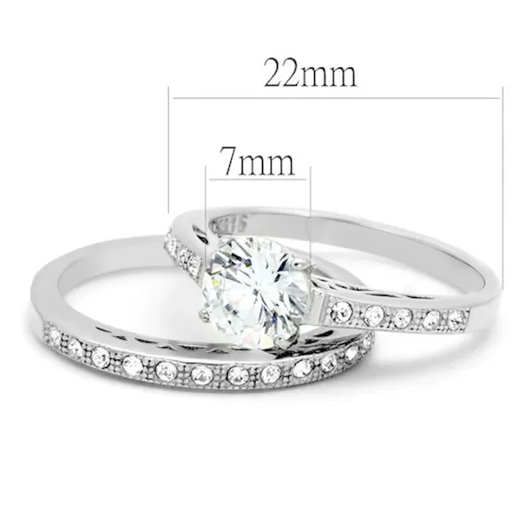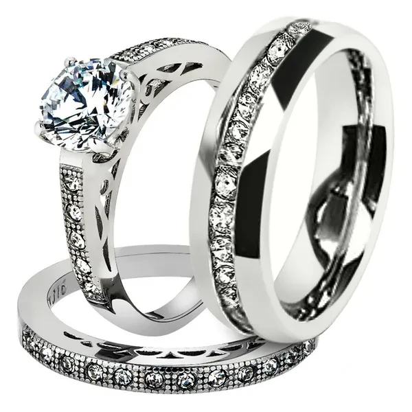 This women's 2 piece AAA grade cubic Zirconia wedding set is Amazing! Made of solid surgical stainless steel with no plating and a high polished finish. This engagement ring showcases a 1.28 ct (7mm) round cut center stone accented by 10 (1mm) round pave set side stones. Matching wedding band has 12 (1mm) round cut stones in a pave setting. The total approximate diamond equivalent weight is 1.39 carat. Our stones are made of the highest quality, is cut to perfection and display amazing clarity, just like real diamonds! Stainless steel 316 jewelry is very durable, will never oxidize and is hypo-allergenic.