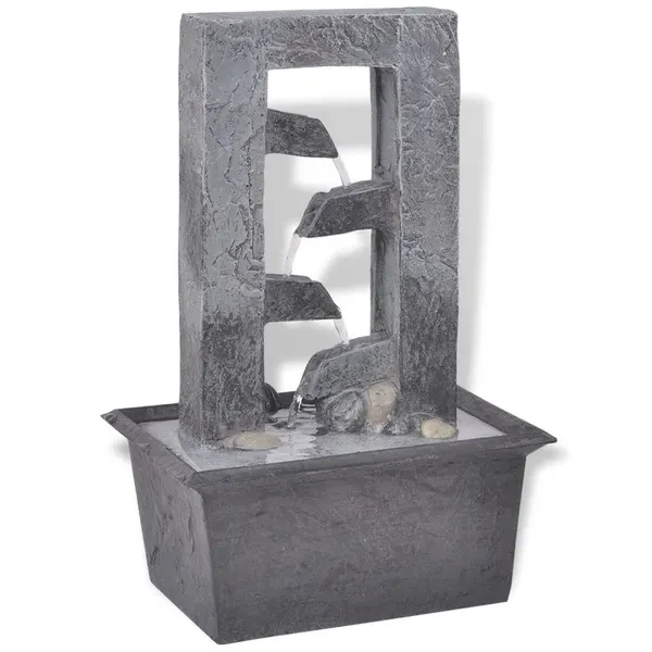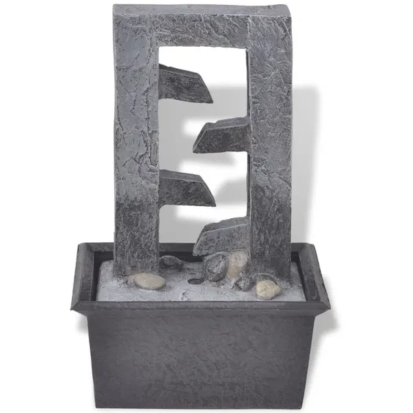 This LED indoor fountain is an excellent choice to create a natural atmosphere in your living space. This trickling water feature will enrich any decor. It is illuminated with LEDs, which creates a wonderful visual effect, especially at night. Made from polyresin, it is UV resistant, which means that it will always look good and will keep its color in direct sunlight. The many flowing water currents and the soothing sound of the trickling water create a relaxing and meditative atmosphere. The supplied high quality pump ensures safe and reliable operation. This completely independent water feature can be placed anywhere in your house. Material: Polyresin Dimensions: 15.8 x 11.8 x 24 cm (L x W x H ) Power supply input: 230-240 V, 50 Hz, 30 mA Power consumption LED light: 2 W Easy to use 1 x adapter 1 x LED light 1 x pump 1 x water feature