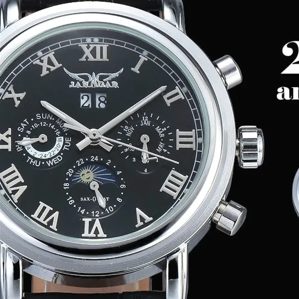 Item Type: Mechanical Wristwatches Feature: Complete Calendar,Luminous Hands,Moon Phase Band Material Type: Leather Water Resistance Depth: No waterproof Dial Window Material Type: Glass Movement: Automatic Self-Wind Clasp Type: Buckle Brand Name: JARAGAR Case Material: Stainless Steel Packing Including: -1*Mechanical Watch -1*Gift Box -1*Instruction Thanks for visiting our sotre~