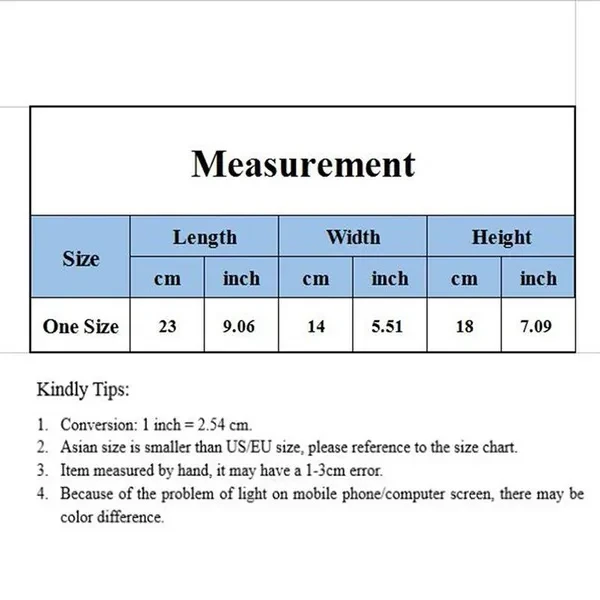 Features Color: Black,Khaki,Light gray,Red,Dark gray Size: Length and width and height 23*14*18cm Material: PU leather Package Content: 1 bag Warm Tips: 1. Conversion: 1 Inch=2.54CM; 2. Color may little vary due to different display setting; 3. Size might be slightly deviation due to hand measurement, please allow 1-2 cm difference.
