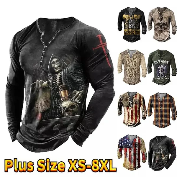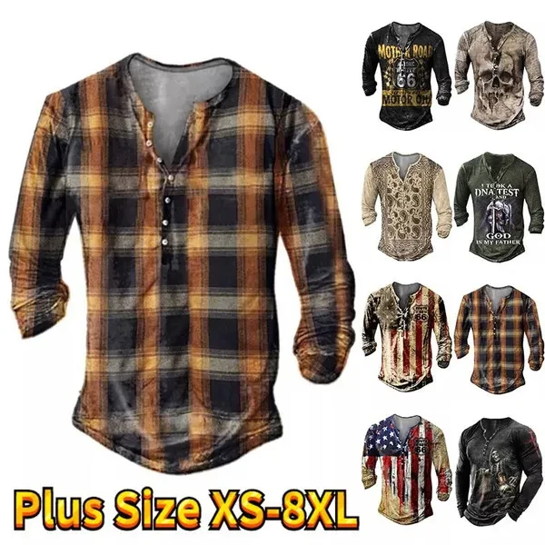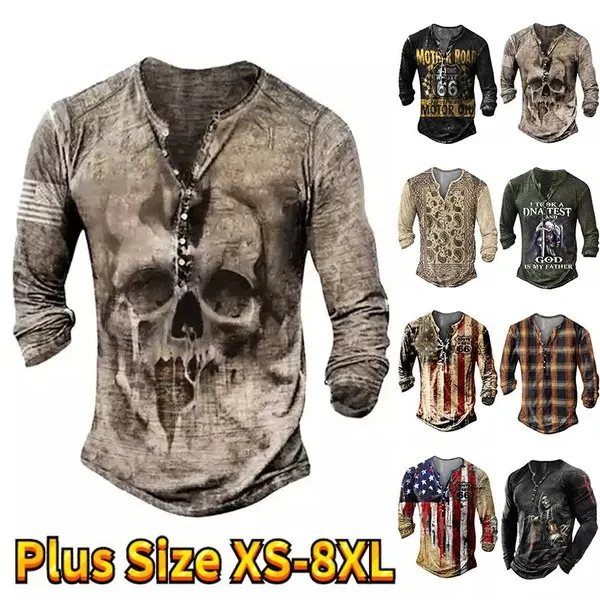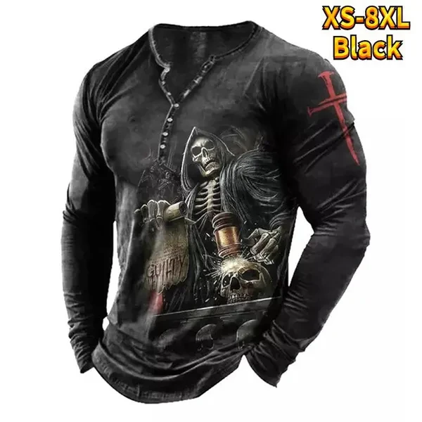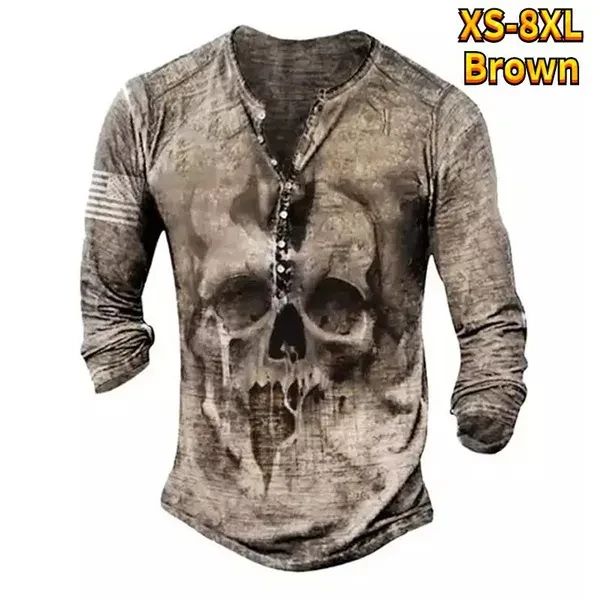 Men's Autumn Skull Head Element Plaid Printed Handsome Steady Hundred Take Inside Pullover Winter Men Boys Casual Fashion Button Long Sleeve T-shirt Man Teenagers Button Long Sleeve Tops Plus Size XS-