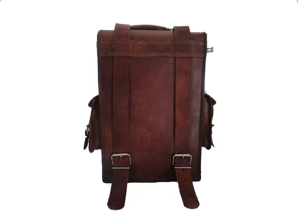 Description Leather Backpack Rucksack Sling Satchel messenger bag 2 in 1 purpose VINTAGE HANDMADE GOAT LEATHER MESSENGER BAGS SATCHEL BUSINESS BAG ADJUSTABLE SHOULDER STRAP 100% genuine goat leather messenger bag with a durable inner lining made of canvas. Designed to carry mini laptops, tab, documents or other personal belongings, etc. A genuine hand made product using chemical/dye-free leather. Natural oils and light have been used to obtain the style of the leather - chemical free! This bag features a wonderful unique and vintage look, designed to carry mini laptops, tab, documents, personal belongings etc. Perfect for the office, school or as a gift! Specifications: Size 11 inch wide X 15 inch height X 4.5 inch Depth Made from 100% genuine, strong, lightweight, durable goat leather, tanned without the use of chemicals Adjustable shoulder strap, roll close backpack with small front pocket. 2 big inner compartment for carrying files, mini laptop's, tab's etc with padding. 2 zipper compartments for important documents/paperwork etc. Inner canvas lining Vintage leather wash. Leather softens and darkens with use. Handmade in India by experienced crafts people