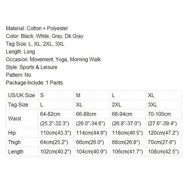 Feature: Attention: Due to the tag size is Asian size ,We have the size conversion chart in the picture. Please read the size chart before you buy, thank you. 1. 100% Brand New. 2. Style: Sports & Leisure 3. Material: Modal cotton 4. Color: Black, White, Dark Grey 5. Tag Size: M,L, XL, 2XL, 3XL 6. Length: Long 7. Occasion: Movement, Yoga, Morning Walk 8. US/UK Size S M L XL Tag Size: L XL 2XL 3XL Waist: 64-82cm 66-88cm 68-94cm 70-100cm (25.2"-32.3") (26.0"-34.6") (26.8"-37.0") (27.6"-39.4") Hip: 110cm(43.3") 114cm(44.9") 118cm(46.5") 120cm(47.2") Thigh: 64cm(25.2") 66cm(26.0") 68cm(26.8") 70cm(27.6") Length: 102cm(40.2") 104cm(40.9") 106cm(41.7") 108cm(42.5") Package Include: 1 X Pants