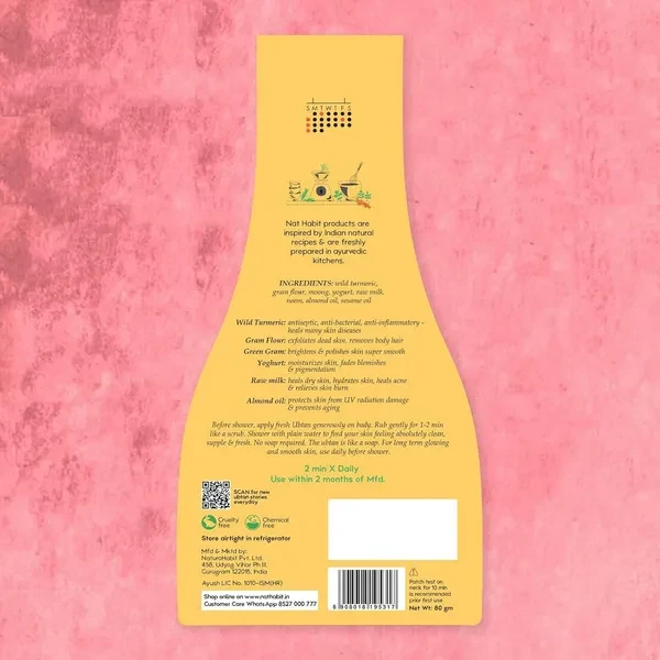 QUICK 2 MIN BODY SCRUB for natural body cleansing: Our Natural Bath Ubtan is a traditional skincare solution that has been cherished for centuries in India. | Ingredients: Wild Turmeric, Besan, Yoghurt, Raw Milk, Almond Oil, Provides gentle and safe body exfoliation for Skin Radiance,Baby soft extreme smooth & healthy skin. | Body Acne Control For All Skin Types : Our Natural Bath Ubtan gently exfoliates your skin, removing dead cells and providing a more youthful complexion. Hydration & moisture locking for supple skin. | Aids in accelerated Detan, spot & blemish removal :Renowned for its anti-inflammatory and brightening properties, turmeric helps in reducing skin blemishes and adds a natural radiance to your skin. | Radiant skin with dullness & pigmentation relief,Age & wrinkle protection with improved elasticity. Use this Ubtan Daily for a healthy and radiant complexion. It can also be used as a body scrub to exfoliate your skin all over. | How To Use :Before showering, apply fresh bath ubtan generously on the body. Rub gently for 1-2 min like a scrub. Shower with plain water to find your skin feeling absolutely clean, supple & fresh. No soap is required. The ubtan is like soap. For long term glowing and smooth skin, use daily before a shower.