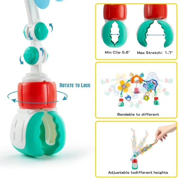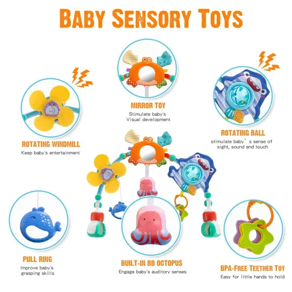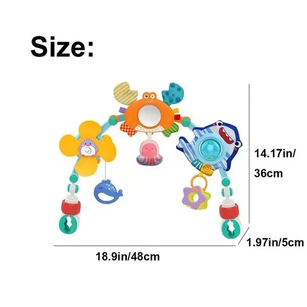 Entertained Car Seat Toy: Keep your baby engaged and entertained during car rides with this stroller arch toy that conveniently clips onto your little one's car seat handle. Baby Stroller Toys with Sensory Activity Toys:Designed with vibrant colors and a playful layout, this stroller toy offers a variety of detachable toys that encourage the development of motor skills and enhance hand-eye coordination. Universal Stroller Arch:No matter if you have a stroller, car seat,bouncer,or Crib, this baby arch toy effortlessly accommodates any baby gear with its adjustable clips and straps, ensuring a secure and versatile fit. Safe and Durable:Made with high-quality and non-toxic materials,guarantees the utmost safety for your little one and can be easily cleaned and maintained. Perfect Gift for Newborn and Infant: Looking for a practical and memorable baby shower gift,bassinet mobile, birthday gift, Christmas gift for your baby? This stroller toy is sure to please new parents and provide their little one with hours of fun and entertainment