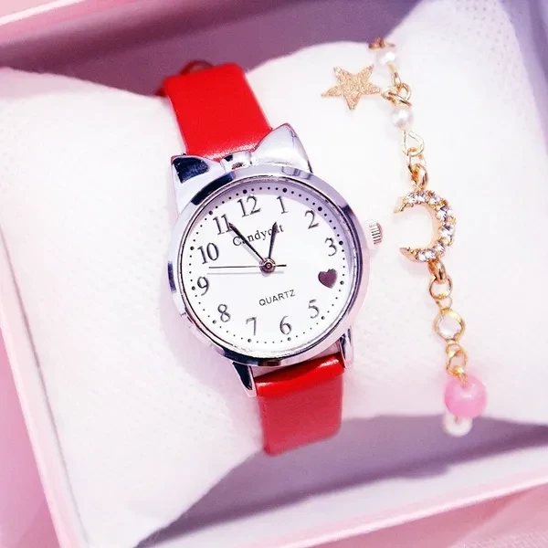 Feature: 100% New and high quality Gender :Student child girl Fashion Lovely And High Quality Trendy Watch! Movement: quartz watch Surface diameter: 2.7CM Dial thickness: 0.8CM Strap width: 1.4CM Strap length: 23CM Band material:Leather Case material: Alloy Perfect gift for Student child girl. suitable for any occasion(party, business, casual , daily life). Package contains : 1 x watch (excluding retail packaging box and bracelet)