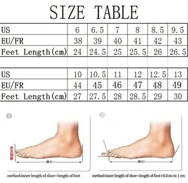 Welcome to our shop, I wish you a happy shopping! 100% brand new and high quality Tip: If you like to wear loose shoes, please choose a size one size larger than usual. Since the American shoe size and the Chinese shoe size are not exactly the same, the following shoe sizes are for reference only: (best choice method: check foot length) Men's shoe size: US 6 = EU 38 = Foot length 23.5-24 cm U.S. 6.5 = EU 39 = foot length 24-24.5 cm US 7 = EU 40 = Foot length 24.5-25 cm United States 8 = European Union 41 = Foot length 25-25.5 cm US 8.5 = EU 42 = Foot length 25.5-26 cm U.S. 9.5 = EU 43 = foot length 26-26.5 cm U.S. 10 = EU 44 = Foot length 26.5-27 cm US 11 = EU 45 = Foot length 27-27.5 cm US 12 = EU 46 = Foot length 27.5-28 cm US 12.5 = EU 47 = Foot length 28-28.5 cm US 13 = EU 48 = Foot length 28.5-29 cm *If you have any questions, please feel free to contact us. *Please compare the size chart before placing an order, I wish you a happy shopping! , (All dimensions are in centimeters, please note that 1cm=0.39 inches) For example, if your foot is 25.3 cm, you should choose a US size 8. Reminder: shoe size is subject to European size and actual foot length. If you are not sure about the length of your feet, please measure the length of your feet as follows. Tips: The measurement is the maximum size, please allow a tolerance of about 0.5-1 cm. Please carefully compare the size of the chart with the length of your feet before ordering. 1. Please choose your size according to your foot length 2. If you do not measure the foot length, another method is to measure the insole length of the shoes you are wearing, according to the insole length of the table, and then select the shoe size Due to the computer monitor, there may be some color errors, please don't mind! I wish you a pleasant shopping experience at Wish! have a beautiful day! ! !
