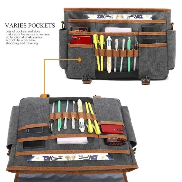 Brand: CoolBELL Description: Multi-functional Messenger Bag Size: 17.7 x 11.8 x 3.5 inches; Fits up to 15.6 inches laptop. Weight: 1.0 kg Color: Black Grey Material: Canvas; 210D waterproof polyester lining Large capacity for you: Fits up to 15.6 inches laptop like macbook,dell,asus, lenovo etc.Reasonable capacity is perfect for daily use like school life, work. business, and travel etc. Include a 15.6 inches laptop compartment, designed with elastic to fix the laptop, more protection for your electronics. Still more room for keeping books, documents,phones etc, ideal design for school / student. A wide flap to provides double protection for your valuables. Roomy Main compartment. The main compartment keeps 15.6 inch laptop, iPad, books, two-days clothes.Laptop compartment designed with Veclo strap to fix laptop, more safe and more protection. Varies pockets. Under the flap,5 small pockets, 1 big pockets,7 pen slots; 3 small pockets with zipper on the flap; Include a removable pouch with Velcro for keeping bus card. Two side pockets for keep water bottles. Design for business men, students, teachers etc. You could use this functional messenger bag for school life, business activity, daily time, shopping, travel etc. Functional bag design for you. Lightweight design is easy for carrying. Two carrying style: Shoulder bag and messenger bag, handbag. More details Metal Buckle design with 2 metal buckles, improve quality and level in appearance. Real leather Decorade with real leather, this bag can be more good-looking and durable. Card slot A remove card slot to paste on the bag with Velcro, you could use it to hold bus card, quickly use it when paying. Real leather handle To improve the holding feeling, we use real leather to produce the handle, make it comfortable and durable for you. Package Include: 1 x Messenger Bag