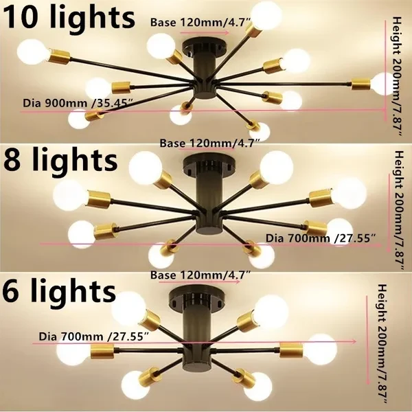 Specifications : Light material: Metal(Iron) Dimension: as the Picture display Finish: Painted by black /white Wattage: 6/8/10*60W depending on the bulb of each lamp holder Suitable Space: 15-30 Sq Voltage: 110V-240v Bulb Included or No : Bulbs Not Included Light source type: Incandescent bulbs, CFLs and LED bulbs Application: Indoor Style: Traditonal,Retro,Industry Installation type: Hardwired installation by a licensed electrician Voltage:110-240v for America Bulb Base: E26/27 (The bulb is sold separately) Idea for installing in bedroom,living room,foyers,dining room,kitchen,decorative lighting,barn wood,rustic/industrial decor,bar,cafe and hotel Packing include: 1pcs x Lamp base