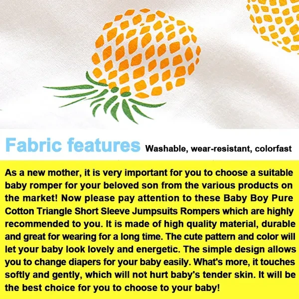 Size chart: Size / Recommended Height / Length / Bust / Shoulder Widt / Leg Circumference / Hip Circumference 0-6 months 66cm 42 50 21 24 58 6-12 months 73cm 45 52 22 24 60 12-18 months 80cm 48 54 23 26 62 18-24 months 90cm 51 56 24 28 64 Hello, welcome to my shop! Our products are ready stock, we will arrange shipments for you within 24 hours. We ship from China, it usually takes 15-40 days to arrive. If you have any questions, please contact me via chat. Please delay your response during public holidays. Thank you! Q: Is it available? Is it in stock? A: All those who can order are in stock. Q: When will it be shipped? A: Shipped on the same day, and also on Saturday and Sunday. Introductions: As a new mother, it is very important for you to choose a suitable baby romper for your beloved son from the various products on the market! Now please pay attention to these Baby Boy Pure Cotton Triangle Short Sleeve Jumpsuits Rompers which are highly recommended to you. It is made of high quality material, durable and great for wearing for a long time. The cute pattern and color will let your baby look lovely and energetic. The simple design allows you to change diapers for your baby easily. What's more, it touches softly and gently, which will not hurt baby's tender skin. It will be the best choice for you to choose to your baby! Features: 1. New and high quality. 2. Easy for changing diapers. 3. So lovely elegant dress is perfect to wear in any occasions. 4. It touches very softly and gently, so that it will not hurt the tender skin of the baby, it is absolutely the best choice of caring mommy. 5. This design is very lovely and matches with the lovely little baby very well. Specifications: 1. Color & Pattern: 7 colors 2. Material: Cotton 3. Size: 0-24M 4. Suitable for: Baby Boy & Girl 5.Item Type: Sleeveless Rompers 6.Pattern Type:Cartoon 7.Closure Type:Covered Button 8.sleeve:Short sleeve 9.Collar:O-neck 10.pattern:Print 11.Fit:Fits true to size, take your normal size 12. Washable: Yes Package Includes: 1 x Rompers Size chart: Size / Recommended Height / Length / Bust / Shoulder Widt / Leg Circumference / Hip Circumference 0-6 months 66cm 42 50 21 24 58 6-12 months 73cm 45 52 22 24 60 12-18 months 80cm 48 54 23 26 62 18-24 months 90cm 51 56 24 28 64