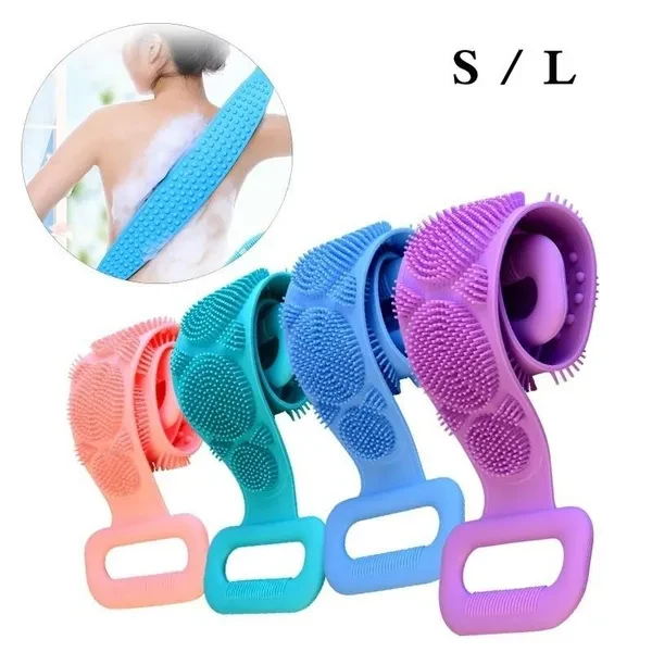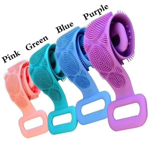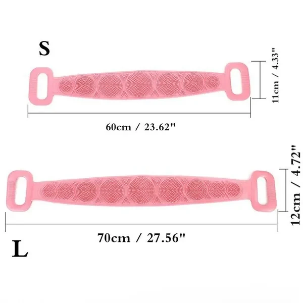 Silicone bath towel Silicone Brushes Bath Towels Rubbing Back Mud Peeling Body Massage Shower Extended Scrubber Skin Clean Shower Brushes Silicone Bath Brush Color: blue; pink; purple; sky blue Material: Silicone Size: S:60 * 11cm,L:70 * 12cm Weight: about 175g / 215g Mighty scrubber that effectively cleans the hard to reach part of the body. Made of 100% silicone making it flexible and pain free. Strongly deep cleans pores, removes dirt, excess oil and dead skin for smoother and healthier body. Double sided lines and silicone bristles and bumps for effective cleaning and massaging. Perfect for all ages. Package includes: 1 * silicone bath towel