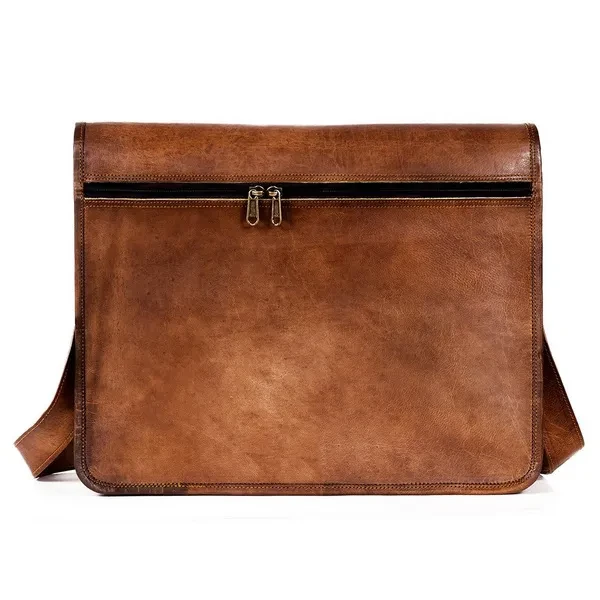 Key features * Hand-polished full-grain goat leather – smooth minimalist finish that gains a rich vintage patina. * Slim 16 × 12 in (41 × 30 cm) – carries 15-16″ laptop, A4 folders and notebook with room to spare. * Low-profile flap with hidden snap studs – clean look, quick access. * Rear full-width zip pocket keeps passport & phone secure yet handy. * Fixed 1.5″ wide leather shoulder strap with brass slider adjusts in length. * Soft cotton lining plus pen loops and slip divider to organise tech and docs. * Solid brass hardware – buckle, rivets, and YKK zipper pull are rust-proof. Vaqar’s Leather craftsmanship We hand-polish and wax each hide, then hand-cut, saddle-stitch, and edge-burnish every panel in our Jaipur workshop. Natural grain marks or slight stitch variations signal true artisan work—no factory clones. Care tips Wipe dust with a dry cloth. If moisture hits the leather, blot, air-dry away from heat, then condition lightly with neutral balm.