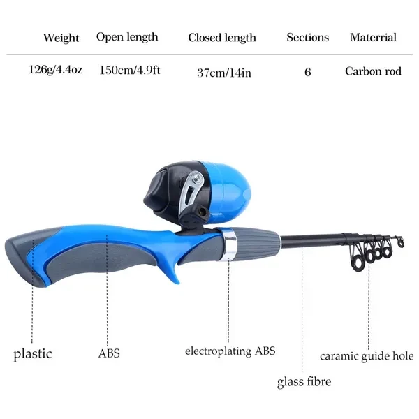 Rod and Reel Feature: Constructed from carbon fiber mixed with fiberglass Pre-spooled with 6 lb. line Length: 5.24ft Power: Medium-Light Pieces: 1 Bearings: 1 Line Weight (lb.) 6-8 Retrieve: Right Hand Products Description: 1. Kids fishing combo full kits suitable for new beginners. 2. Spincast Reel is easy to cast for kids. 3. Kinds of fishing lures meet your different requires. 4. Bite-Alert notifies you when fish take the bait. 5. Floating bobber also notifies you when fish take the bait. 6. Fishing line is used for spare. 7. Backpacks can be used to hold these fishing gear, which is very convenient to carry. 8. PVC rubber handles help you keep your grip How to cast the spin cast reel: You should start your cast with the lure dangling about a foot off the end of the rod tip. To cast, push the button down and hold it down while bringing the rod behind you to a complete stop. Then bring the rod forward to about the 11 o'clock position and let go of the button to cast the lure and line into the water. Sougayilang 48 Pieces kids fishing combo kit includes : 1 x telescopic fishing pole 1 x spincast reel 1 x Carry case bag 1 x Fishing Float 1 x Fishing Bell 3 x Paddle Tail Swimbaits 5 x Fishing Swivels 5 x Fishing Line Sinker Slides 5 x Fishing Bobber Stopper 1 x Box Fishing Hooks