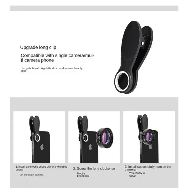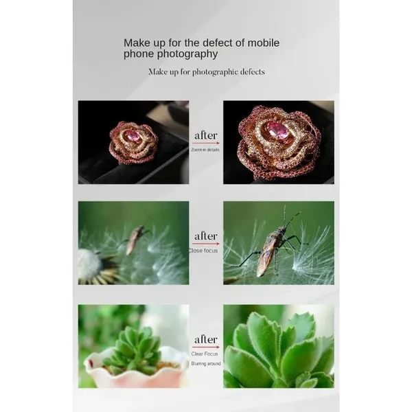 Color: Black Applicable brand: Mobile universal Applicable model: universal for mobile phones Product material: aluminum alloy, optical glass, ABS Packaging: 1 macro lens for mobile phones (excluding polarizers and stargazers)