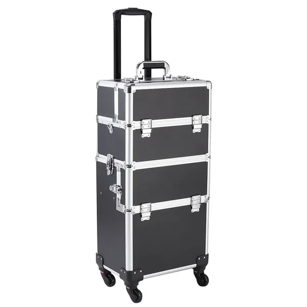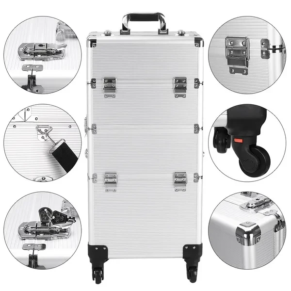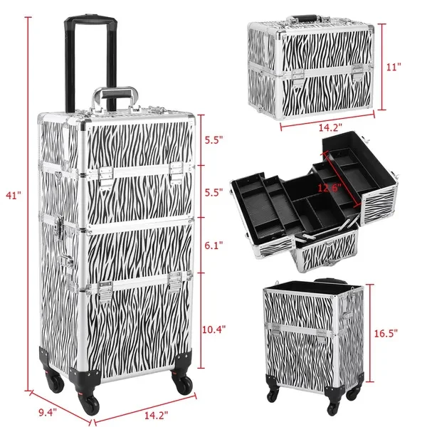 Specifications: 1. Material: Aluminum Alloy 2. Overall Cosmetic Box Organizer Trolley Dimensions: (14.17 x 9.45 x 27.95)" / (36 x 24 x 71)cm (L x W x H) 3. Overall Trolley Makeup Case with Handle and Casters Dimensions: (14.17 x 9.45 x 40.94)" / (36 x 24 x 104)cm (L x W x H) 4. Top Section: (14.17 x 9.45 x 11)" / (36 x 24 x 28)cm (L x W x H) 5. Bottom Section: (14.17 x 9.45 x 16.54)" / (36 x 24 x 42)cm (L x W x H) 6. Pattern: White Zebra Print 7. Weight: 246.92oz / 7000g Package Includes: 1 x Cosmetic Case 1 x Shoulder Strap 4 x Keys 4 x Detachable Universal Wheels Features: 1. The unique design of the grip handle makes you comfortable 2. With 3 in 1 design, this makeup case is nice to look and easy to use 3. Stylish and elegant 4. Professional cosmetic makeup case 5. This makeup case is perfect for carrying around your makeup, cosmetics 6. Made of high quality material, durable