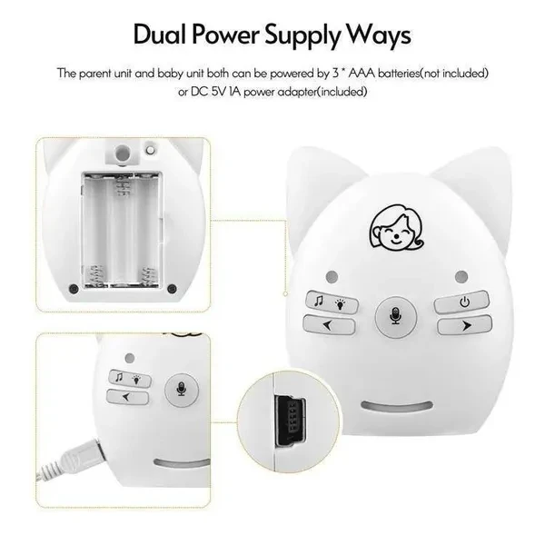 Specification: Model Number: V30 Connection Type: Wireless Operating frequency: ISM 905-925MHz Transmission power: 10 dBm Modulation mode: FSK Spread spectrum method: FHHS Audio encoding: ADPCM Modulation frequency: 180 KHz Code rate: 500 Kbps Receiver sensitivity: ≦-92 dBm Power supply mode: 5V USB or 3pcs AA dry battery Transmitter operating current: 180 mA MAX (all open) Transmitter standby current: 75 mA MAX Receiver operating current: 75 mA MAX Battery specifications: 3pcs 1.2V AA dry battery Operating Temperature: 0°C-50°C Packing list:1 x Baby Unit, 1 x Parent Unit, 1 x AC adaptor for baby unit, 1 x AC adaptor for parent unit, 1 x English Manual (Batterise is not included) Main Features: *2.4GHz digital wireless transmission, stable transmission signal. *Built-in MIC and speaker for two-way audio monitoring. *High sensitivity, the crying voice is easy to be heard and the lamp will turn on to inform parents. *Easy pairing, plug and play in. *Position the transmitter at a distance of about 1.5-2.0 meters from the baby. *Both parent unit and baby unit can be powered by DC 5V or 3*1.5V AAA battery. *Volume adjustment *Two-way intercom, support for data encryption *Both the receiver have built-in microphones and speakers *Open space transmission range up to 250M