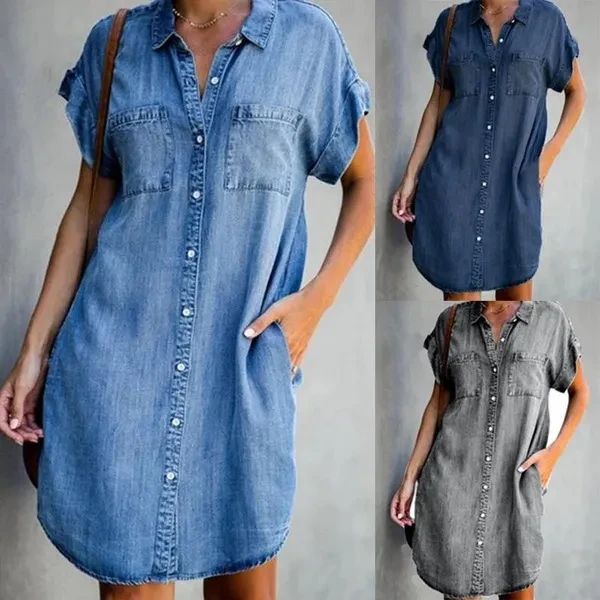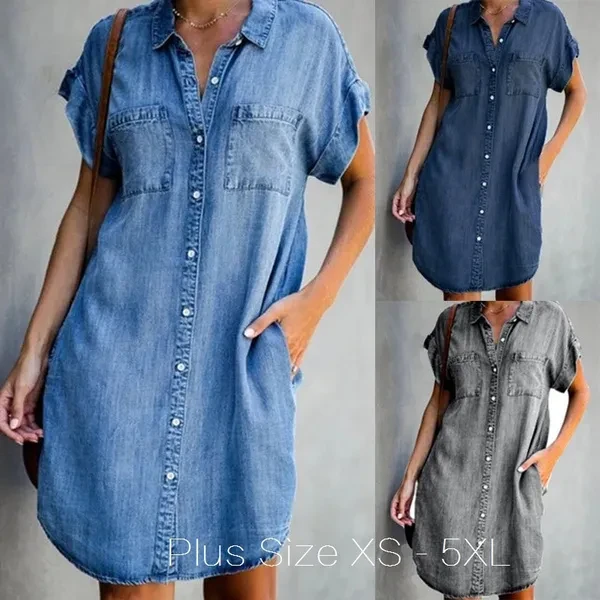 Women Fashion Short Sleeve Denim Blue Long Tops V Neck Shirt Dress Denim Dress Plus SizeXS- 5XL