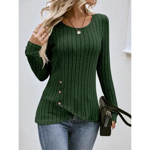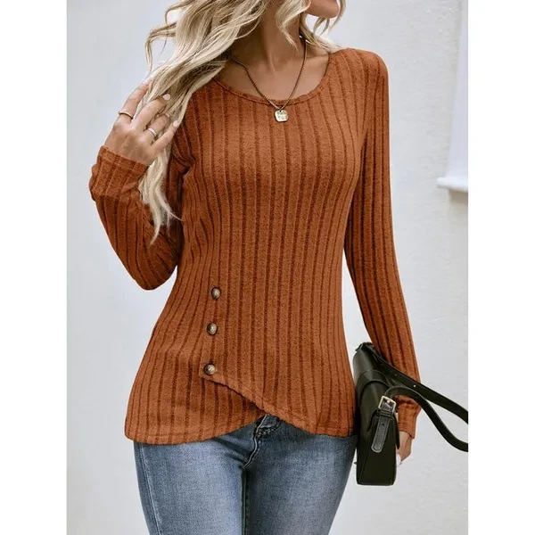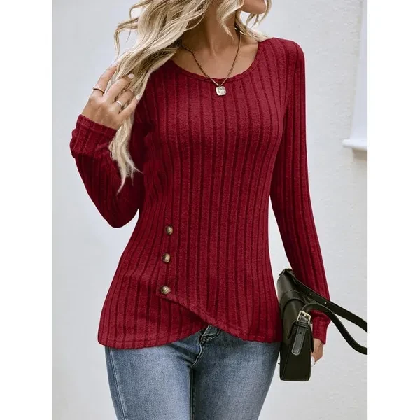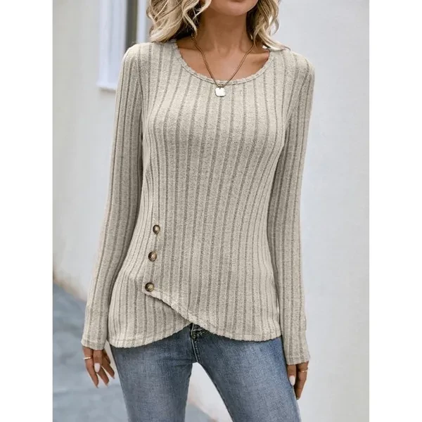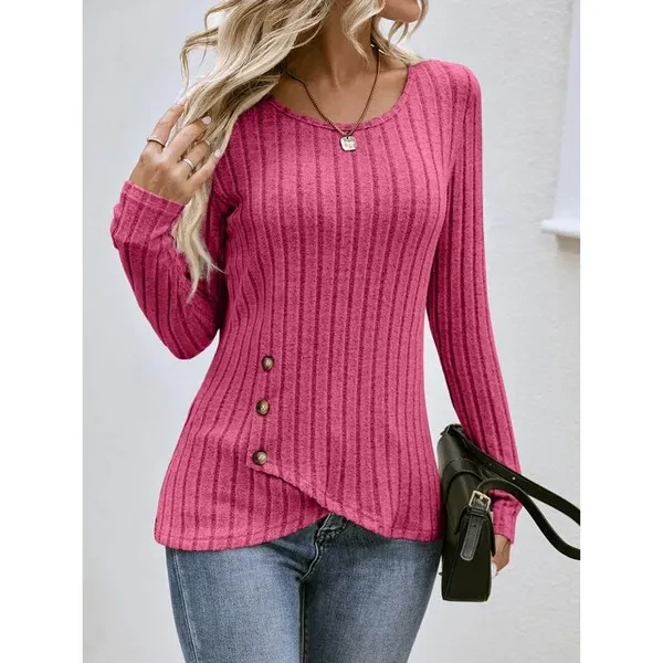 Women's Fashion Casual Screw Thread Blouses Ladies Round Neck Long-sleeved T-shirts Bottoming Shirts Solid Color